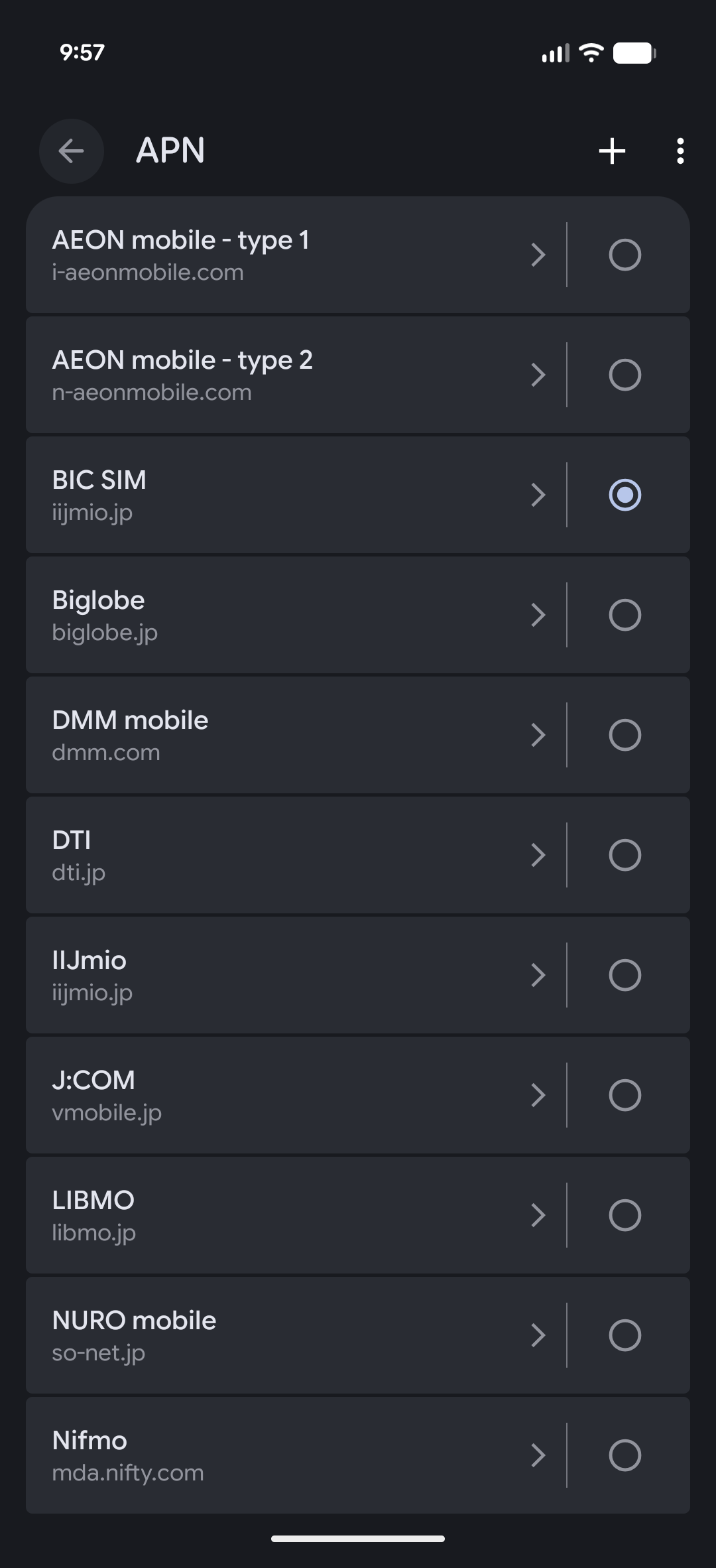 でも、設定から「APN」(小文字でもヒットする)で検索して「その他」の「アクセスポイント名」に入り「BIC SIM」を選んだら繋がった。