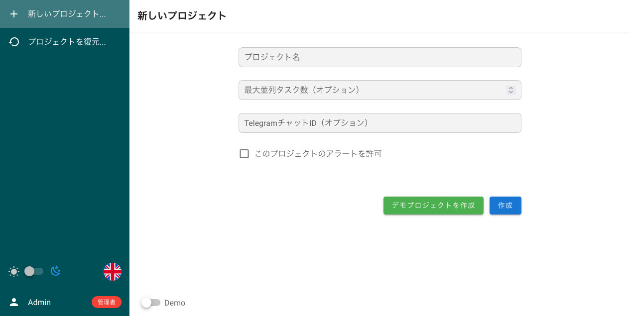 docker-compose.yml で指定した SEMAPHORE_ADMIN と SEMAPHORE_ADMIN_PASSWORD でログインすれば以下の初期画面が表示される。